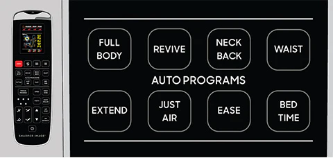 Convenient and easy-to-use choreographed programs. Choose from Full Body. Revive. Neck Back. Waist. Extend. Just Air. Ease. Bed Time.